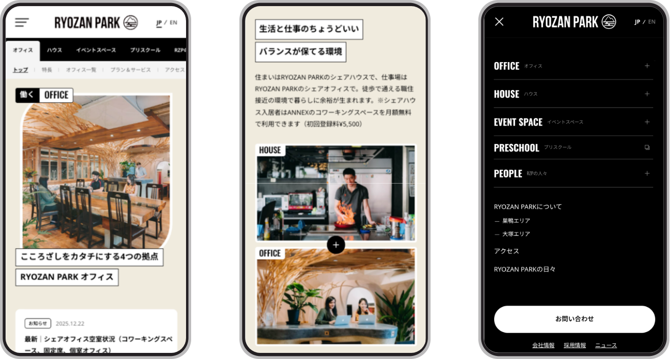 東京の巣鴨と大塚に拠点を構える、シェアオフィス・シェアハウス・イベントスペースの複合施設「RYOZAN PARK」のWebサイトリニューアルを担当しました。