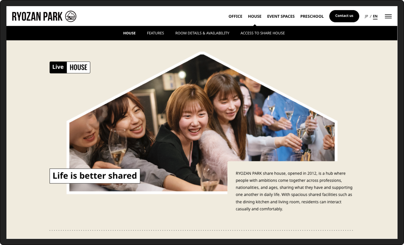 入居者の多様性に合わせ、英語サイトも制作。国内外を問わず、この場所を必要とするすべての人に、RYOZAN PARKの価値が正しく伝わるWebサイトになりました。