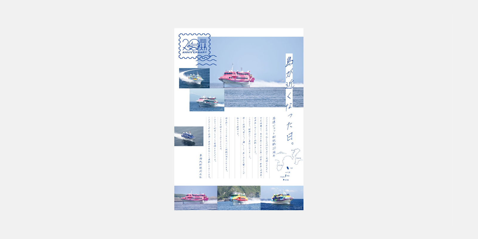 東海汽船株式会社の高速ジェット船20周年の記念ポスターを制作しました。高速ジェット船によって本土から島へは気軽に行けるようになりました。そのため、「島が近くなった日。」というキャッチコピーをご提案し、東海汽船からの手紙の…