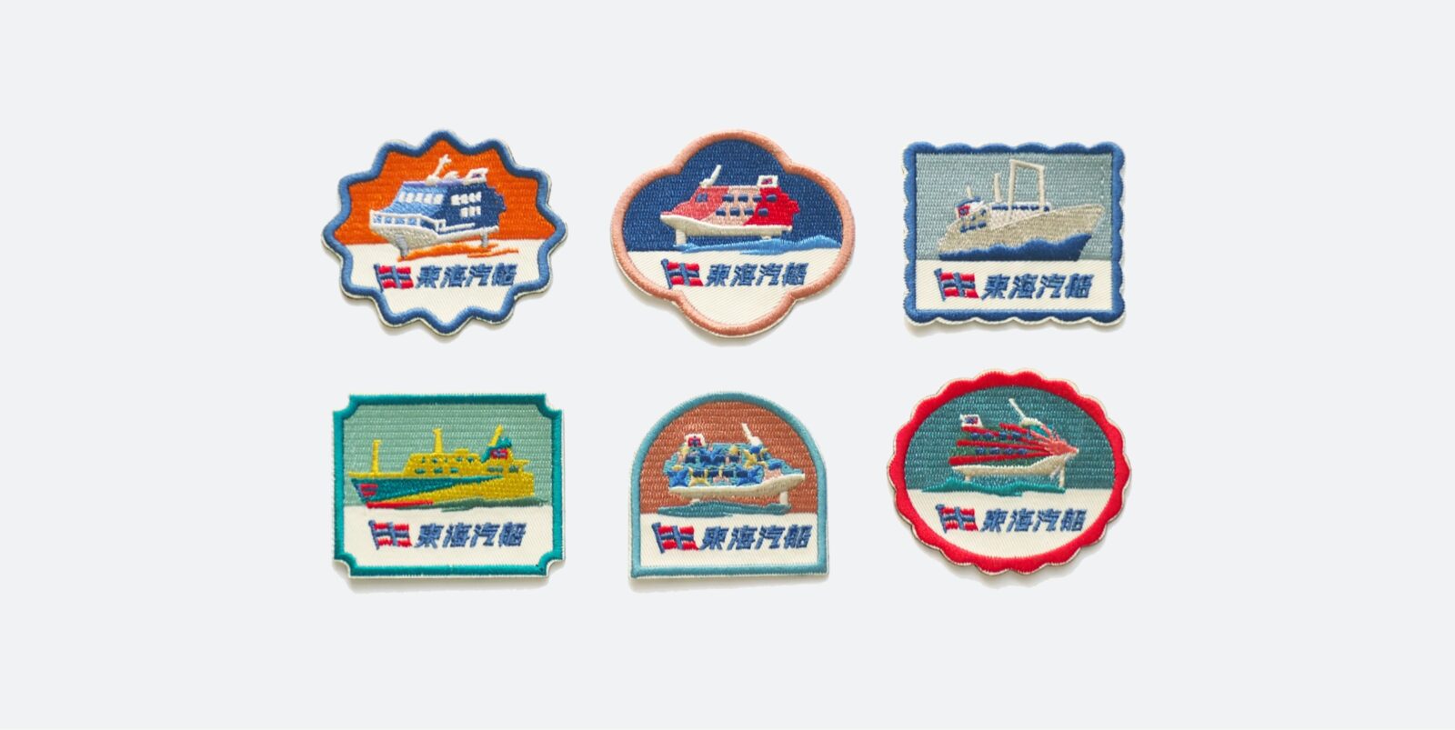 東海マリンサービス株式会社のオリジナルグッズとして、刺繍ステッカー&ワッペンのデザインをお手伝いさせていただきました。東海汽船株式会社の船6隻をレトロな雰囲気でデザインしました。集めるのが楽しくなるように、形もそれぞれ変えて作っています。
